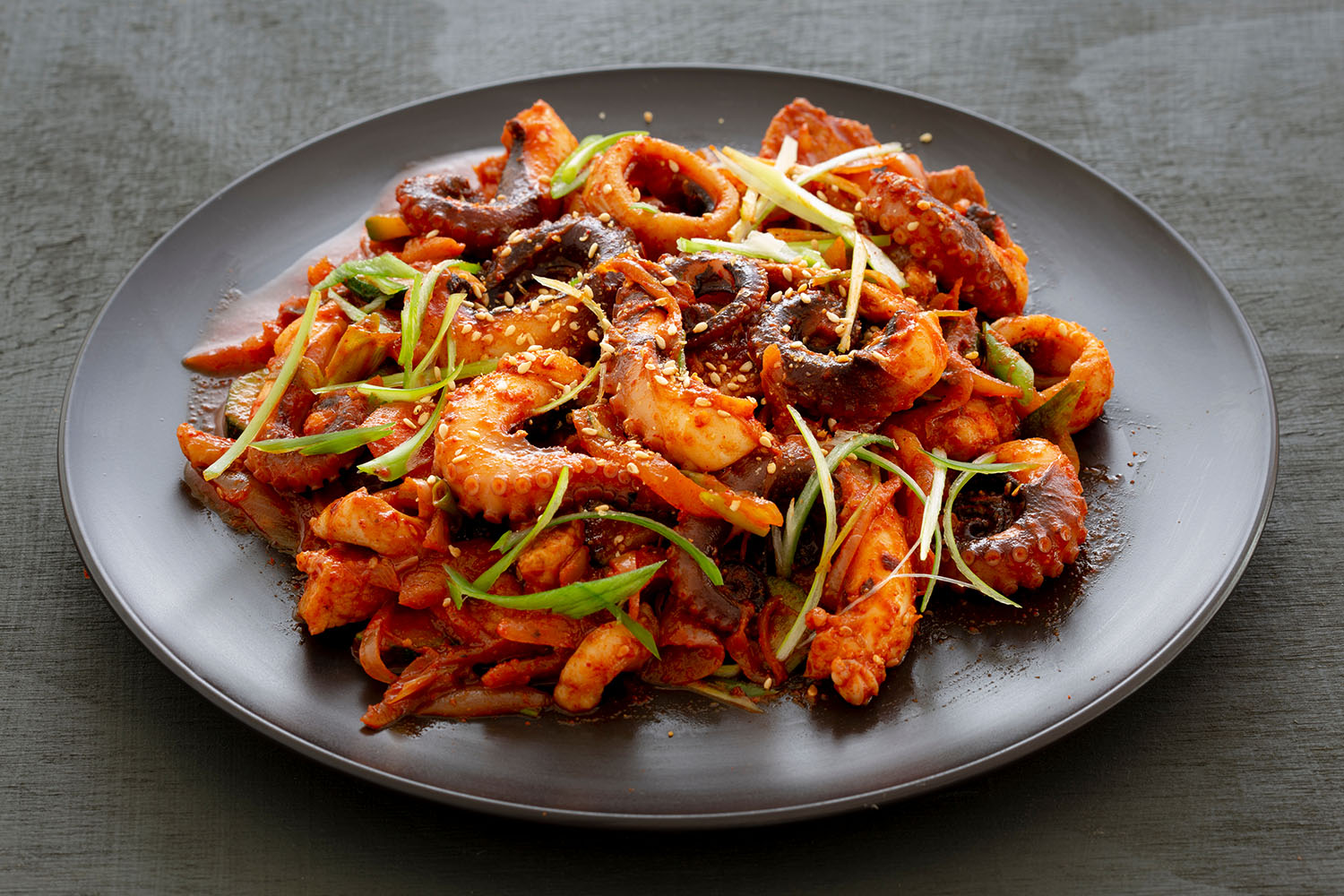 Thêm mực và gia vị vào. Xào trong vài phút cho đến khi mực chuyển sang màu đục, nước sốt và tương ớt thấm đều, bao phủ lấy mực.
